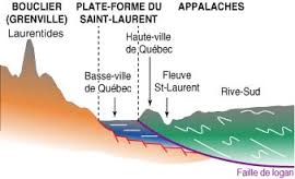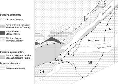 Cette dynamique est l'expression des mouvements de convection qui animent le manteau terrestre, mécanisme permettant à la Terre de dissiper sa chaleur interne vers la surface. En plus du socle grenvillien, les environs de la ville de Québec sont notamment la rencontre des trois principaux ensembles stratigraphiques et structuraux de la zone de Humber externe. Le Grenville affleure à environ une dizaine de kilomètres au Nord de la ville de Québec pour s'étendre de façon continue en direction du nord jusqu’à la péninsule du Labrador. Le socle précambrien est recouvert par des roches ordoviciennes carbonatées et clastiques non-déformées de la Plate-forme du Saint-Laurent, qui forment une bande étroite orientée nord-est s'étendant jusqu'à l'extrémité est de l'Île d'Orléans. Plus au Sud-Est se trouvent les différentes nappes allochtones des Appalaches, constituées de roches du Cambrien à l'Ordovicien moyen, qui se sont mises en place lors de l'orogénie taconienne. Les sédiments déposés au-dessus de l’ancienne marge laurentienne ont été déformés et en partie transportés lors de la mise en place des nappes allochtones. Le domaine parautochtone, ou la zone de failles imbriquées, comprend les sédiments légèrement plissés et faillés. Il est restreint en surface à une bande mince jouxtant le front appalachien et constitué principalement des roches déformées de la séquence flyschique de la Plate-forme du Saint-Laurent. .