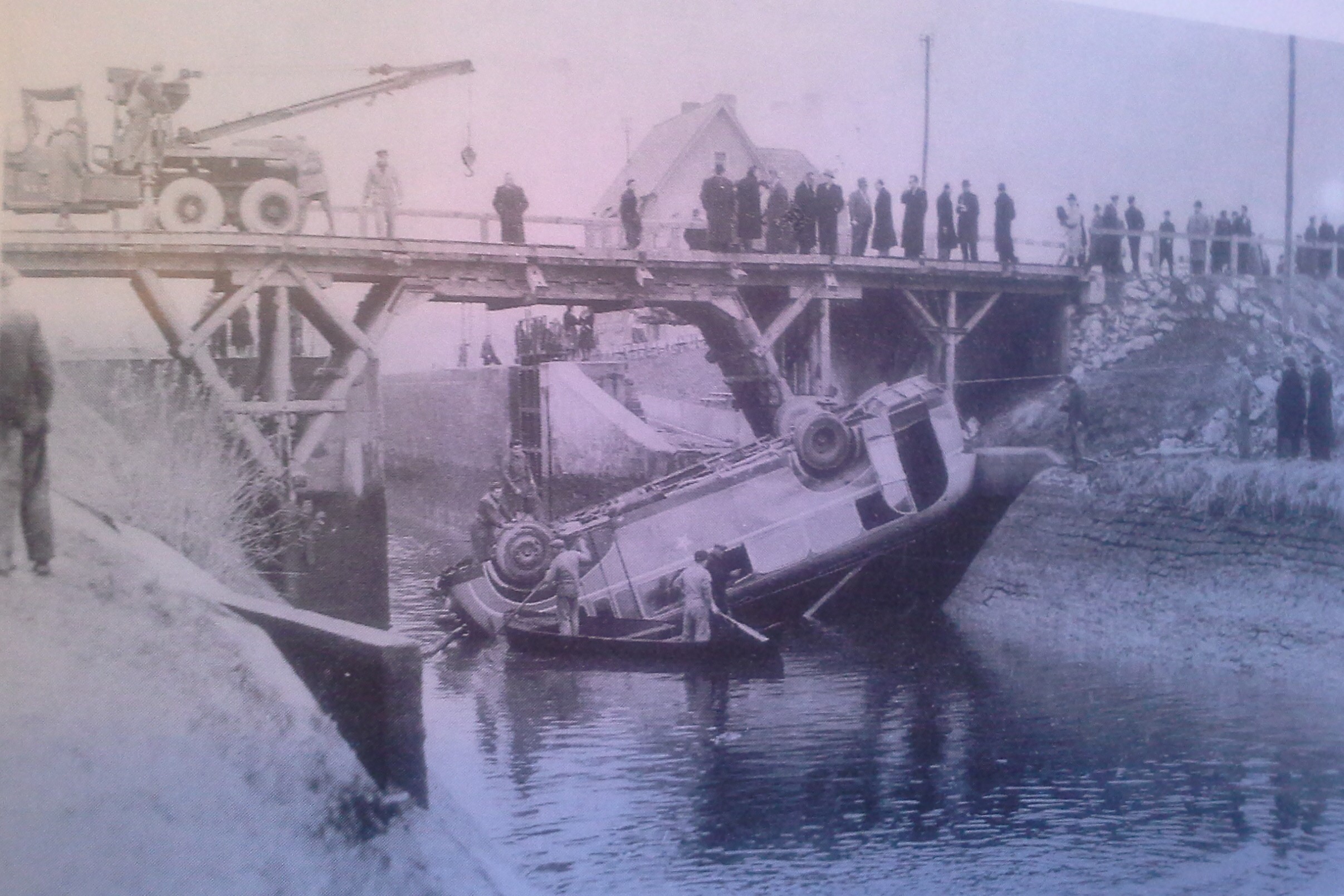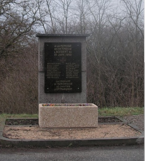 Le 10 janvier 1950 à 6h33 sous une météo défavorable un terrible accident de la circulation se produit au niveau de l’écluse 48 de MUNCHHOUSE. Un autobus de l’Entreprise Martin Busser de COLMAR transportant des ouvriers à la construction de l’usine hydraulique d’Ottmarsheim glisse sur le pont provisoire en bois enjambant le canal du Rhône au Rhin et chute dans l’eau.