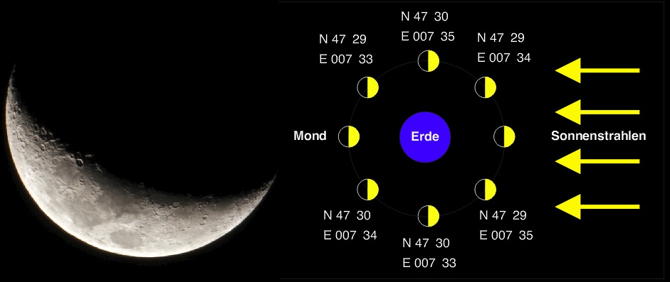 Zuerst muss man verstehen, wie die Mondphasen überhaupt zustande kommen, um den ungefähren Ort des Caches zu finden. N 47 pq und E 007 rs