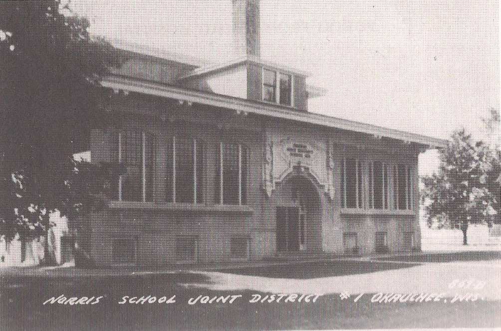 In 1880 Norris married wealthy Fanny Wells (1852-1937) whose father made his millions as a lumber baron. They had one son, Neil. The Norris family had the seven room Norris School designed and built on their property. It became the Okauchee School, which is no longer in use as a school (located a few blocks east of here on the same side of the road), the name Norris is still blocked on the front of the building. The concrete posts next to the school are all that is left of the entrance to the estate.