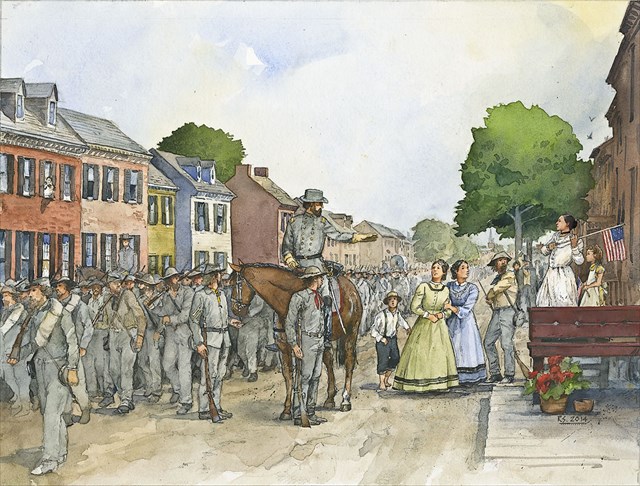 September 1862 marked the first time in the Civil War that a major Southern army crossed the Potomac River. Robert E. Lee marched his Army of Northern Virginia out of his home state just east of the Blue Ridge Mountains and came to a stop in the City of Frederick. This strategic position meant that his army was just two days away from the important political centers of Baltimore and Washington, D.C. Many residents of southern Frederick County, between the Potomac River and the City of Frederick, harbored Confederate sympathies and greeted Lee’s men as liberators. Once the army arrived in town, however, most civilians viewed them as unwelcome invaders.