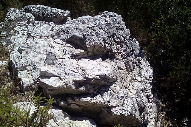 2 - Aproximadamente a 3 metros para Norte, existe uma rocha onde se vê, nitidamente, dois filões de quartzo. Inclua uma foto sua a apontar o filão cuja matriz rochosa envolvente é significativamente diferente do filão. Pista: é um filão com 1 cm de largura.