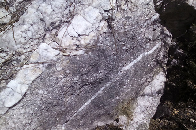 2 - Approximately, 3 meters North, there is a rock where one can, clearly, see two quartz veins. Include, in your log, a photo of your finger pointing the vein that is surrounded by a significant different bedrock. Hint: it’s a 1 cm wide vein.