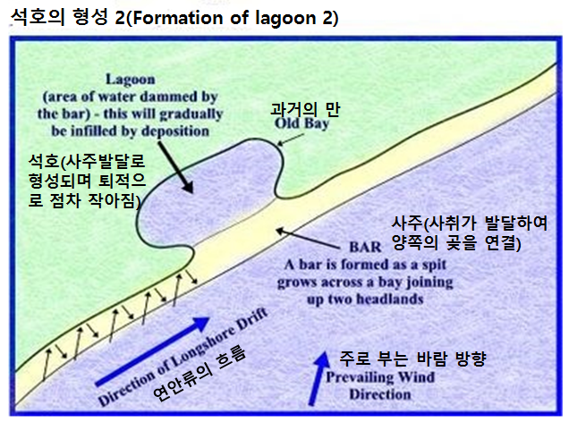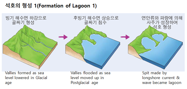 그 후 배후산지에서 하천으로 공급된 모래 퇴적물이 연안 조류와 파랑 작용으로 사주를 만들게 되고, 사주가 성장하여 만의 입구를 가로 막아 바다와 격리된 석호가 형성되었다. 그 시기는 대략 3,000년 전쯤으로 알려져 있다.