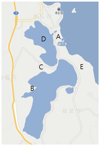 - 사진은 호수 주변의 지도입니다. 호수주변의 자연환경을 자세히 관찰하시고, 아래 내용중 맞지않는 것은 무엇인가요? (1) A는 해안 사취인데, 이것이 성장해서 사주와 해안사빈을 만들고 해안을 단조롭게 하였다. (2) B와 C부분의 하천이 이 석호에 퇴적 물질을 쌓아 놓으면서 점점 호수 면적이 줄어들게 된다. (3) D는 원래 만이었는데, 연안 사주가 성장하면서 석호가 되었다. (4) E는 하천에서 나온 모래나 돌출된 해안이 침식되면서 나온 모래들이 연안류와 파랑의 퇴적작용으로 쌓인 것이다.