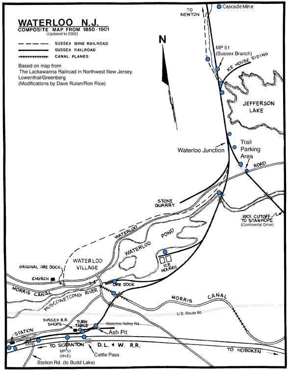 The Sussex Branch Trail as a State Park owned trail begins at the parking lot on Waterloo Road, but the first section of "trail" is actually along Continental Drive, just a bit north of International Drive in International Trade Center near the Holiday Inn. The southern section was actually not part of the main Sussex Branch, but rather the "cutoff" to Stanhope built in 1901 that rendered the older line obsolete. Though it's hard to reach, the section of the Sussex Branch from Morris Canal's Inclined Plane #4 West to the Musconetcong River is walkable, and passes by the ruins of the industrial ice company that once operated at Waterloo Lake.