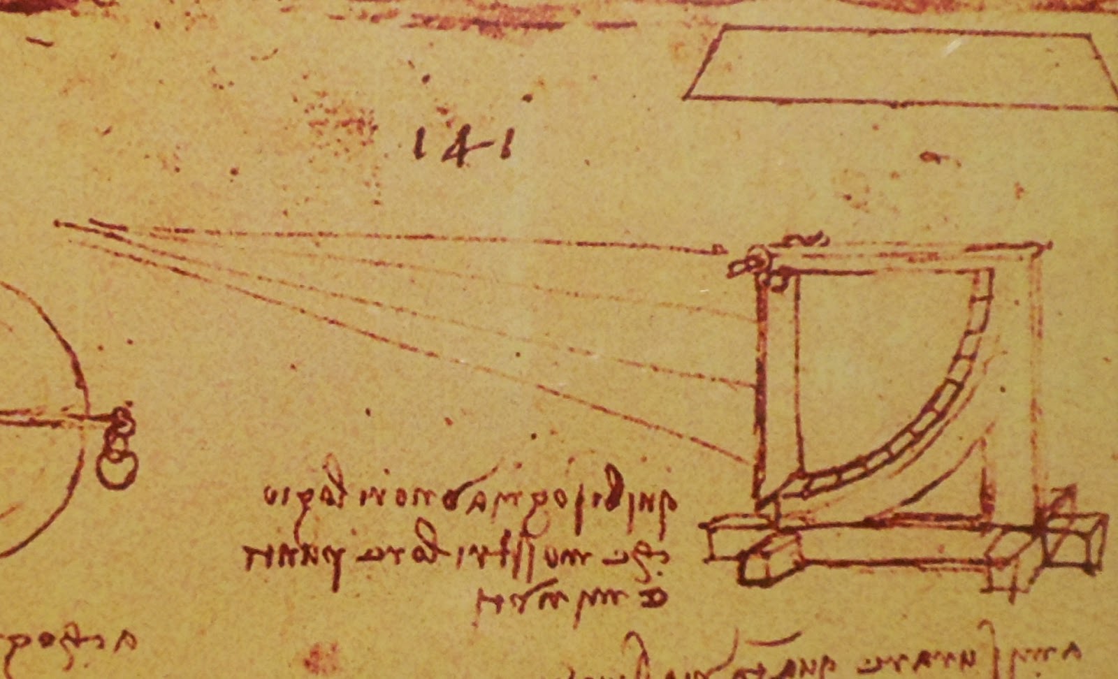 Da Vinci’s anemometer has an arched frame with a rectangular piece of wood hanging in the center by a hinge. When the wind blows, it raises the piece of wood inside the arched frame. Printed on the frame would be a scale. By noting the highest point that the wood reached on the scale, a person could measure the force of the wind.