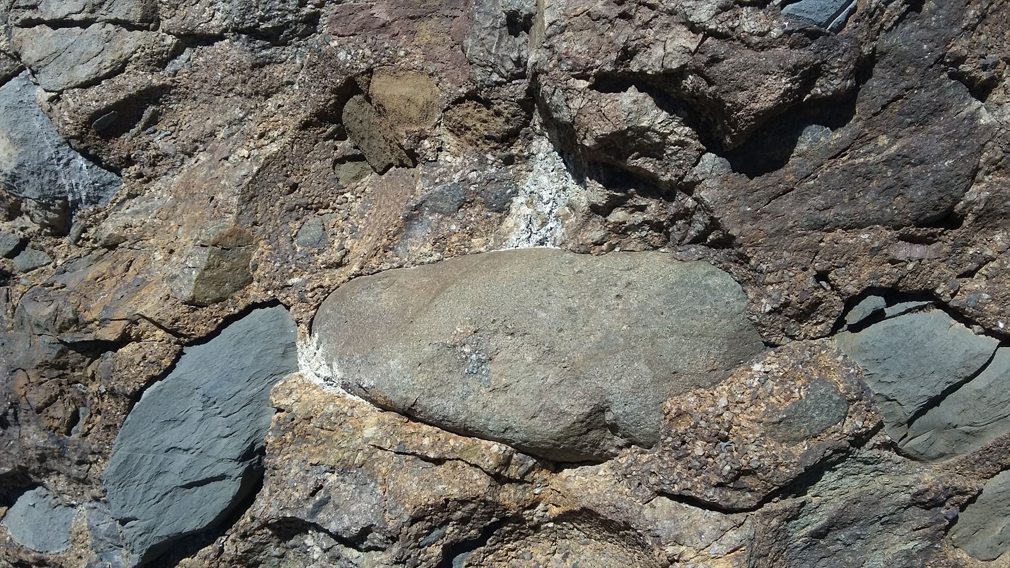 un conglomérat est une roche détritique (issue de la dégradation mécanique d'autres roches) composée de morceaux discernables liés entre eux par un ciment naturel. Pour être considérés comme discernables, les morceaux doivent mesurer plus de 2 mm (en dessous de cette taille, on aurait affaire à un grès et non plus à un conglomérat). Les conglomérats sont le plus souvent de nature sédimentaire, mais ils peuvent également être volcaniques. Dans le cas présent, ils sont d'origine sédimentaire.