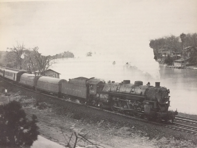 After trains left Netcong, headed up country, rolling along the single-track line. The countryside is mostly wooded, with many cuts and fills on this roller-coaster line. Passing the old resort community of Cranberry Lake, on a curve right at the edge of the lake, only a flag stop, the station with platforms. In summer, passengers would detrain, cross the platform and pass over to the "island" on the little suspension footbridge where many summer cottages lined the opposite shore.