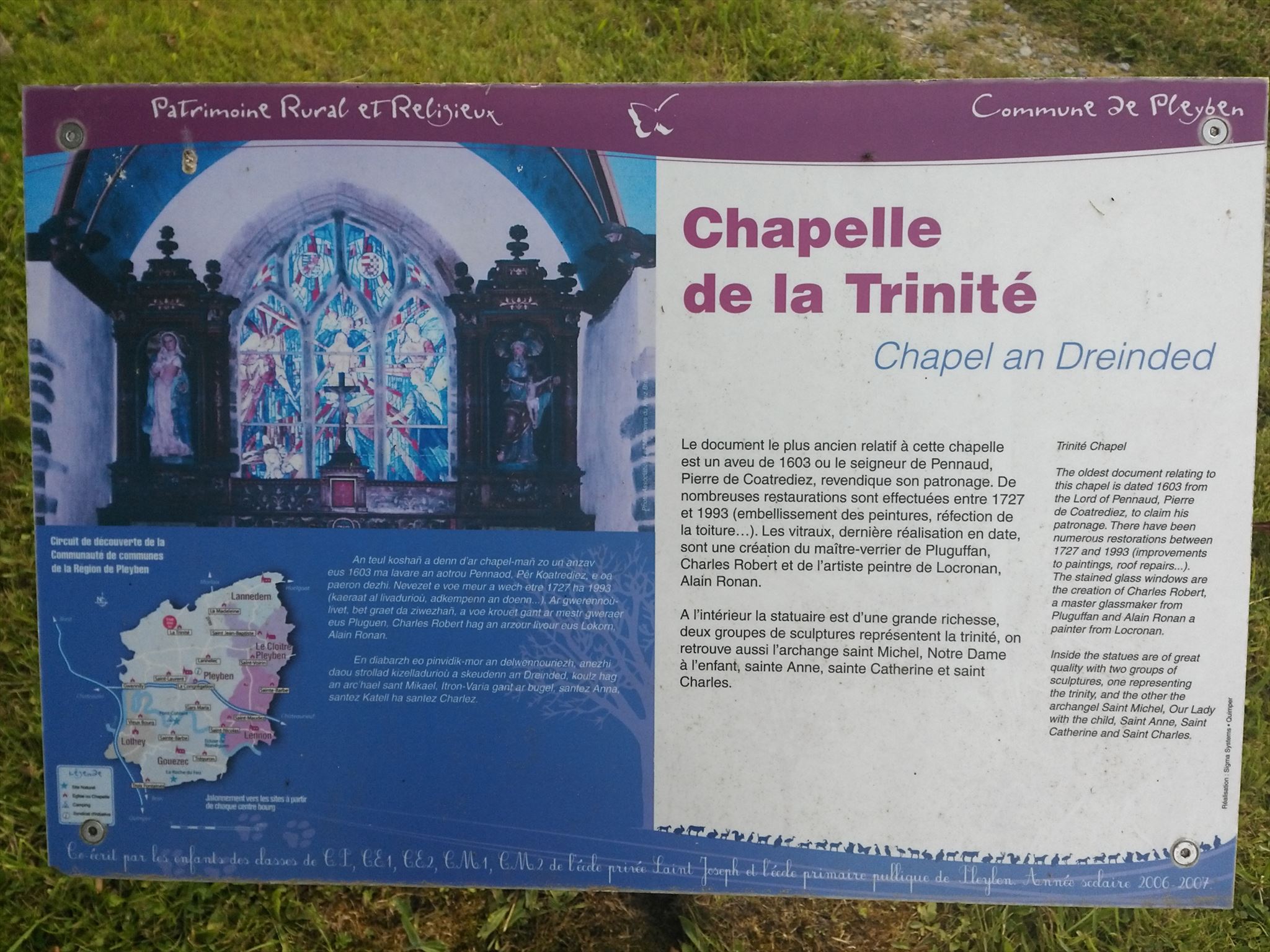La chapelle de la Trinité est située dans une grande prairie verte soigneusement tondue agrémentée d'une table qui nous servira de point d'accueil pour le pique-nique. C'est aussi le point de départ du