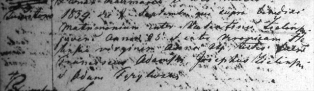 Z zapisu aktu małżeństwa dowiadujemy się również kto był świadkiem na ślubie. Często w parafiach funkcjonowali "etatowi" świadkowie, którzy otrzymywali od ślubujących drobne wynagrodzenie lub byli zapraszani na poczęstunek. Dobrym zwyczajem było również, by świadkami byli ojcowie pary (o ile żyli, czy też inne powody nie pozwalały im dopełnić tego obowiązku). Dodam jeszcze, że w owym czasie świadkami na ślubach byli wyłącznie mężczyźni.