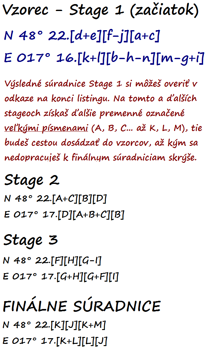 Vyrieš rébus (ten pokojne prenechaj deťom :o)) a vypočítaj súradnice 1. zastávky pomocou prvého vzorca. Na každej ďalšej zastávke musíš vyriešiť nejakú úlohu a získať tak v teréne neznáme premenné (označené už veľkými písmenami). Tie si dosadíš do ďalších vzorcov a tak sa prepracuješ k finálnej krabičke.