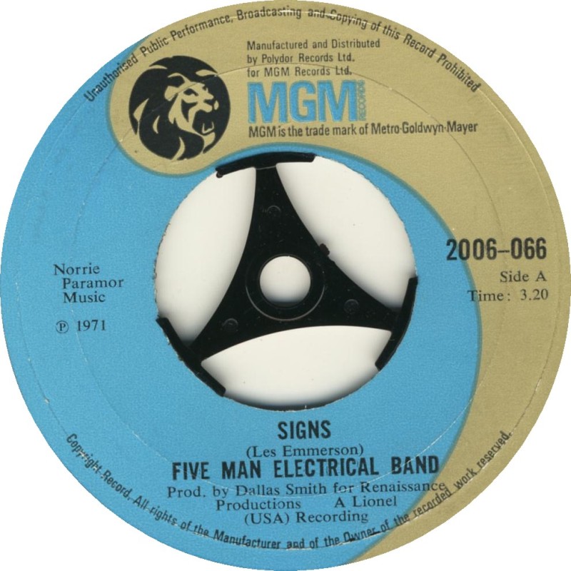 Re-released in 1971 as the A-side, "Signs" reached No. 4 in Canada and No. 3 on the US Billboard Hot 100 chart. Billboard ranked it as the No. 24 song for 1971. It became a gold record.