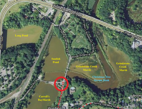 In January of 2000, the RBG implemented an experimental wetland restoration project re-establishing a portion of the channel and creating carp barriers to protect a portion of the wetland. Used Christmas trees, collected by local municipalities, were formed into riverbanks, helping to recreate the natural channel and three wetland regions. Five small carp barrier structures where inserted into the banks blocking carp access to the wetlands while maintaining the natural flow of water and movement of organisms. If you are here when the carp are spawning, you will see just how effective these barriers are. In January 2001 in the Valley Inn Area, the Christmas tree barrier project entered its final phase, crossing Sunfish Pond/Long Pond - the historical outflow link from adjacent Cootes Paradise. Through this project, 13 hectares (32 acres) of wetland habitat are being recreated at the Grindstone Creek Delta. The new habitat allows for the return of abundant plant growth and already attracts wetland wildlife, migrating water birds and spawning fish. Over time, the Christmas trees naturally biodegrade, leaving a build-up of sediment and reeds as a riverbank.