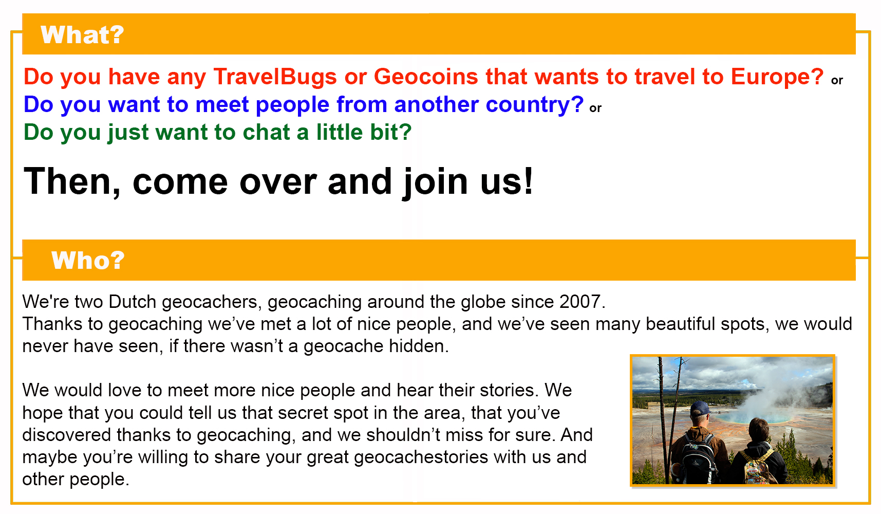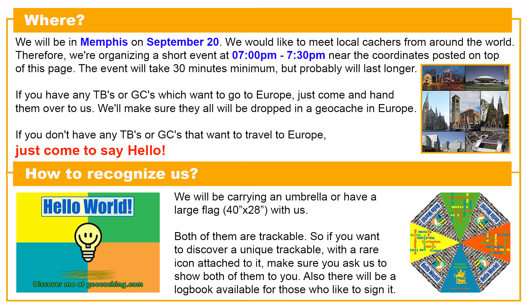 How to recognize us? We'll be carrying an umbrella or have a large flag (40"28") with us.