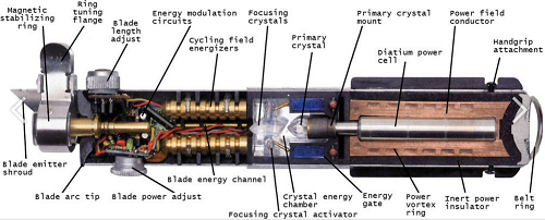 La empuñadura de un sable de luz consistía en un cilindro de aleación de 25 a 30 centímetros de largo, aunque el diseño y las dimensiones de las mismas variaban mucho de acuerdo a las preferencias y necesidades de cada Jedi. La empuñadura contenía los intrincados componentes que creaban y daban forma a la hoja. Energía de alto poder era desatada a través de una serie de lentes y energizadores de enfoque con carga positiva, creando un rayo de energía que se extendía hacia fuera aproximadamente un metro, y después se arqueaba de regreso a una fisura de carga negativa alrededor del emisor. Un superconductor completaba el bucle de energía al canalizar la energía transformada de regreso a la batería interna, donde comenzaba nuevamente el ciclo de energía. Al añadir hasta tres cristales enfocadores de atributos variables, el largo y la potencia de la hoja podía ser ajustada usando mecanismos de control construidos en la empuñadura.