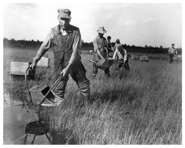 For hundreds of years cranberry harvesters picked the wild berries by hand. Starting in the mid-19th century, the cranberry rake — a hand-held tool with a large comb at one end and a basket at the other pictured above— increased production. The rake allowed leaves and stems to pass through the tines of the comb while collecting the berries in the basket.
