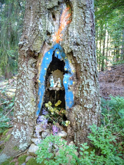 Wędrując niebieskim szlakiem z Wierchomli na Runek natknąłem się na ciekawy obiekt, a mianowicie kapliczkę zrobioną w drzewie. Ciekawy punkt na trasie, a przy okazji dobre miejsce na chwile odpoczynku. Życzę owocnych poszukiwań :)
