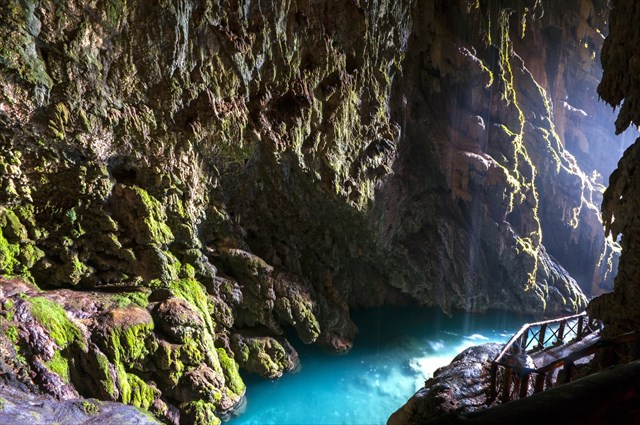 The age of the fossil tufas at “Stone Monastery” ranges from 340,000 years in the Middle Pleistocene to 750 years in the optimal medieval climate. All tufa-forming environments contain organic substrates on which the calcite precipitate forms: mosses, vertically hanging plant stems, or algae, which move on the ceiling of the Iris Cave behind Cola de Caballo waterfall like the ever changing visitors. The calcite precipitation on flora substrates has been so intense in this place of such unique evolution and special formations, that it has outpaced the erosive force of water and has formed the chalky ceiling of the cave we see today.