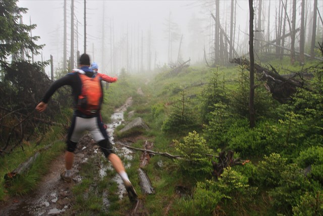 Pokračujeme do studeného kaňonu Kotelních Jam. Z Kotelní Jámy nepříjemně stoupáme dlouhými serpentinami až nad hranici lesa. Před námi i za námi se táhne nekonečný had čelovek ostatních účastníků. Následuje pěkný trailový seběh k horské chatě Dvoračky. Pokračuje se po nekonečném, ale rychlém asfaltu. Stále dolů až do Harrachova (31 km). Z Harrachova vlastně vše teprve opravdu začne. Sem to byl pouze takový zahřívací prolog.