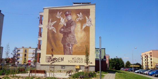 Cache is hidden in an interesting place, which is the first mural in Srem, Poznan work of artist Mark Maksimovich entitled "Letters - Insurgent Wielkopolski". Great portrait in sepia with dimensions of 11 meters to 13 refers to the commitment and effort of inhabitants of the region Śrem in Wielkopolska Uprising victory. The work shows an Insurgent proud Wielkopolski and paper birds made with patriotic letters, which are a symbol of fulfilled dreams Wielkopolan for a free homeland. Prepare the image on the wall of the block took the artists two weeks.