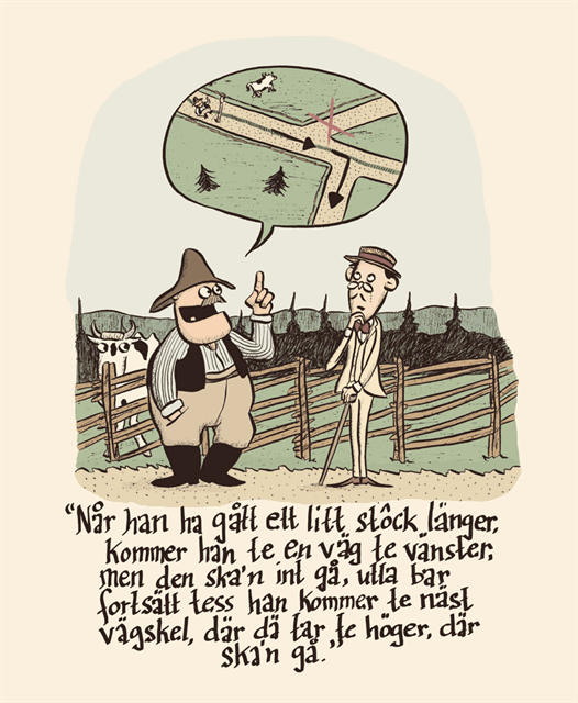 ”Håja, nock vet ja dä”, sa ja. ”D’ä inga kônst te komm dit. Når han ha gått ett litt stöck länger, kommer han te en väg te vänster, men den ska’n int gå, utta bar fortsätt, tess han kommer te näst vägskel, där dä tar å te höger, där ska’n gå.”