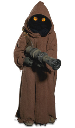 Se desconoce el verdadero aspecto de estos hombrecillos de un metro de altura, pues siempre han usado largas túnicas con capucha para protegerse de los dos ardientes soles de Tatooine. Su lenguaje consiste en un sistema de chirridos de difícil comprensión.