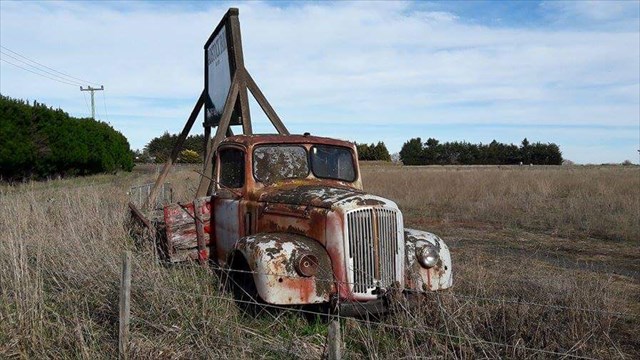 Wow What a Beauty. Once would have been a well used truck on the farm and now is left to Decay but still as a useful vehicle holding up the sign.
