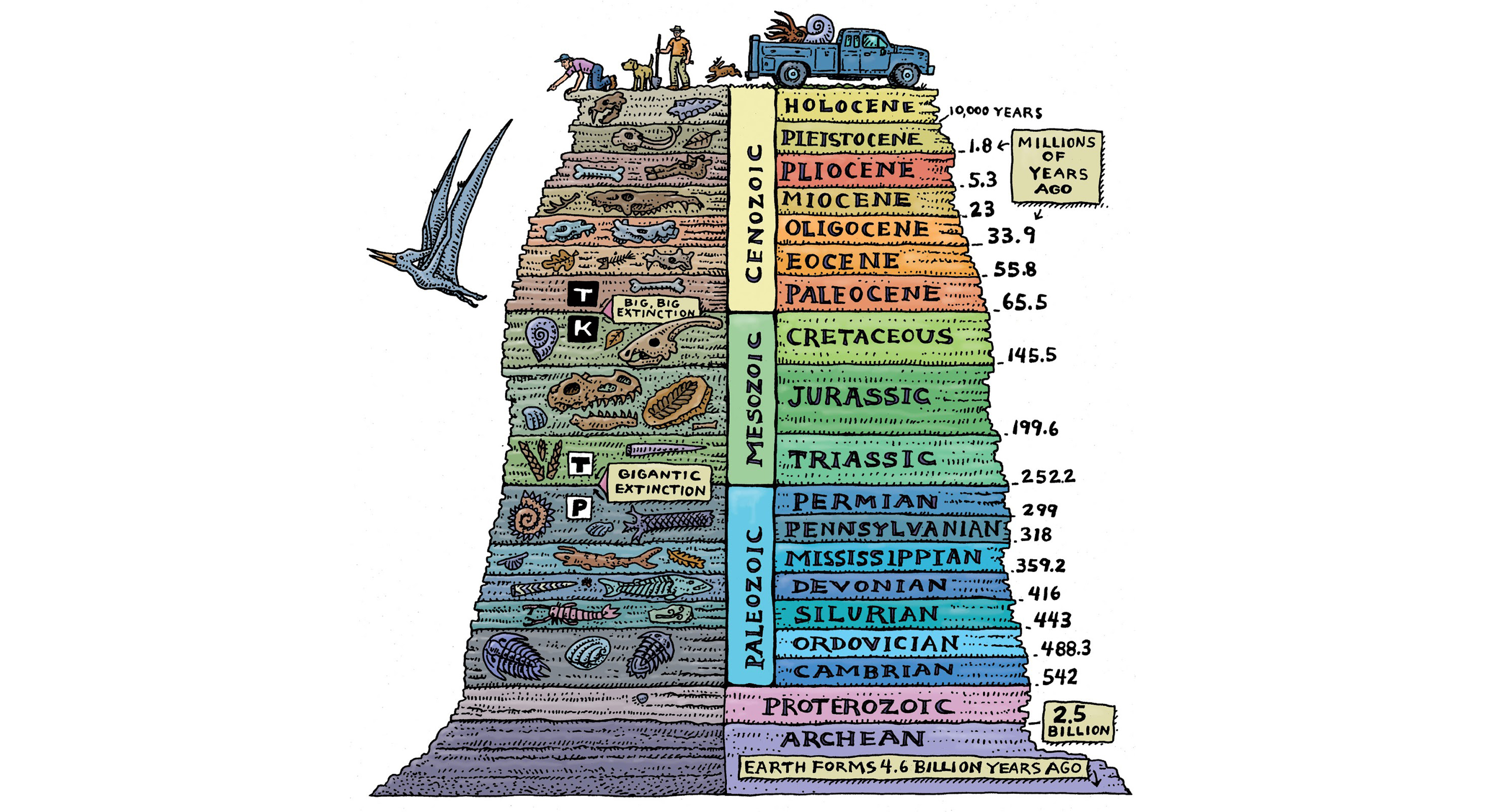 En los inicios de la geología histórica se establecieron tres eras: Paleozoica ("era de los peces"), Mesozoica ("era de los reptiles") y Cenozoica ("era de los mamíferos"). Aunque actualmente las eras son diez, agrupadas en tres eones y divididas en veintidós periodos.