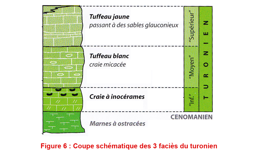 - Le Tuffeau blanc qui s’est formé au turonien moyen dans une mer peu profonde. Il ne s’agit pas à proprement parler d’une craie car en plus du dépôt des coquilles carbonatées des micro-organismes qui permettent de former la craie, le tuffeau comporte une fraction siliceuse conséquente (> 20%), du mica et de la glauconie (un minéral verdâtre caractéristique du domaine marin). On dit que le tuffeau est une craie micacée et glauconieuse. Exploité depuis l’époque gallo-romaine, le tuffeau blanc est la roche utilisée pour les pierres de tailles dont sont bâtis les châteaux de la vallée de la Loire.(Fig.7)