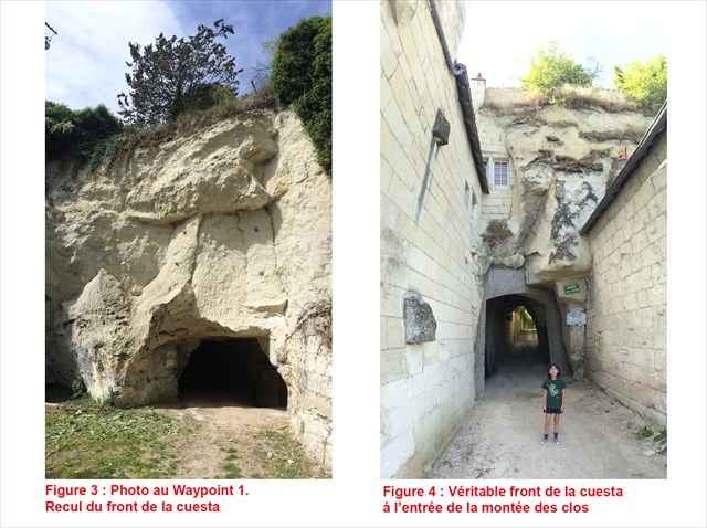 Le Waypoint 1 de la Earthcache (coordonnées publiées de la page) montre que le front de la cuesta qui est en recul (Fig.3). Le véritable front se trouve à l’entrée de la montée des clos (Fig.4) qui vient de la Loire.