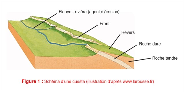 Le mot “cuesta”, d’origine espagnole, renvoie à un relief caractéristique de la bordure des bassins sédimentaires peu déformés et qui comprend une pente raide : son front, et un plateau légèrement incliné : son revers (voir Fig.1)