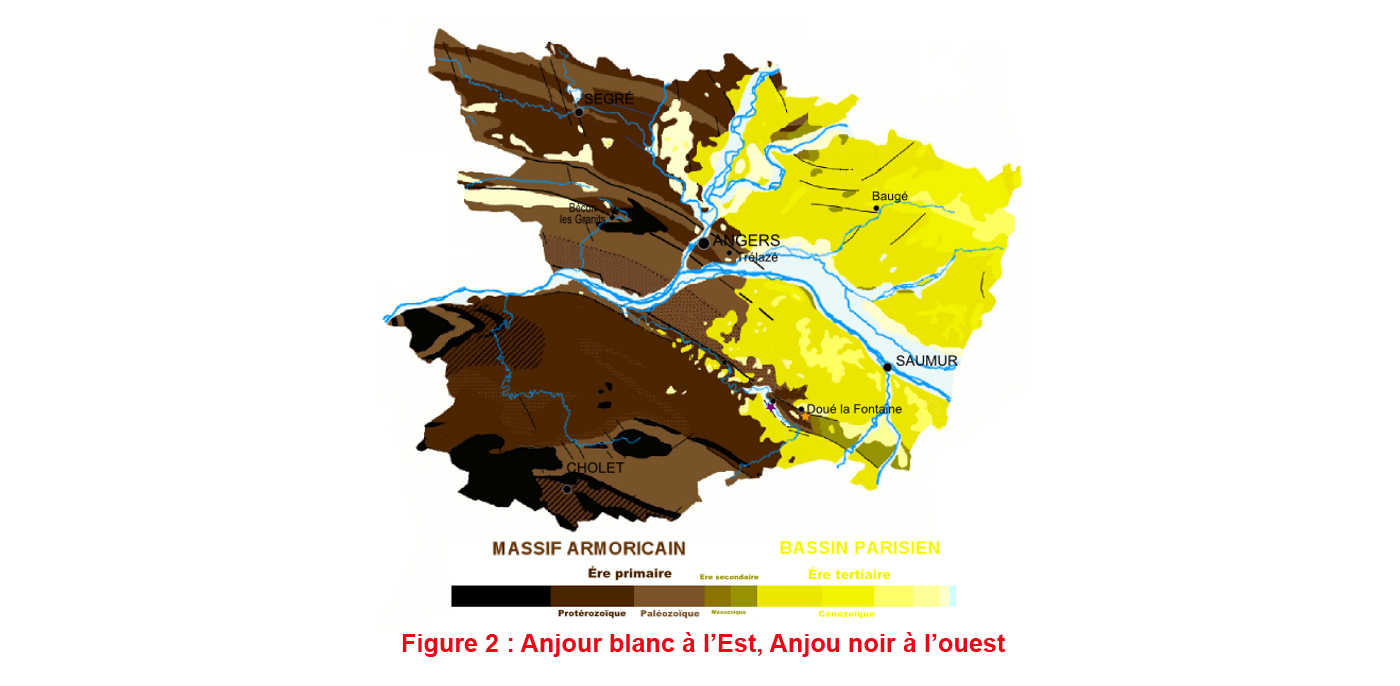Le bassin sédimentaire dont la cuesta saumuroise marque l’une des bordures est le bassin parisien. En effet, d’un point de vue géologique, le saumurois est un peu parisien. Il se situe en Anjou blanc, une partie du département nommée ainsi en raison de la couleur des roches sédimentaires calcaires de son sous-sol. À quelques kilomètres à l’ouest de Saumur c’est presque déjà la Bretagne, les roches sombres que sont le granite et le schiste ardoisier des contreforts du massif armoricain permettent de parler d’Anjou noir (voir Fig.2)