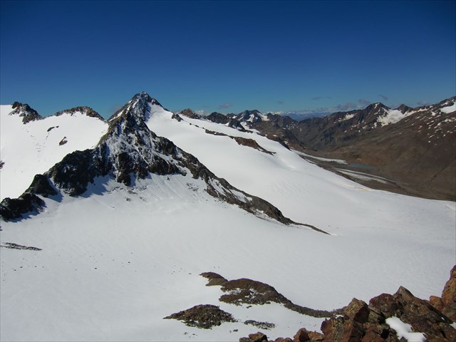 Der Saykogel (auch Seikogel) ist ein idealer Berg für alle, die den Gletschern so nah wie möglich sein wollen, ohne sie betreten zu müssen. Er ragt wie eine schwarze Felsinsel aus den Gletscherströmen und bietet wunderbare Ausblicke auf zahlreiche Dreitausender.