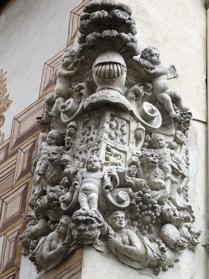 Lo más llamativo es el escudo de la esquina. Esta casa-palacio estaba unida a un jardín situado al otro lado de la calle Fundadora de las Siervas de Jesús, a través de un puentecillo.