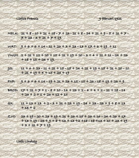 Op een dag vond Francis, tijdens zijn ronde, een flesje met een briefje in. Het briefje leek op een vod, gekreukt, gescheurd en nat, maar er stond tekst op. De tekst op het klein gekreukte briefje was duidelijk aan Francis gericht. Het was van Lindsey! Het leek op een boodschappenlijstje, maar in werkelijkheid beschreef het briefje de plaats waar Lindsey en Francis alleen konden zijn.