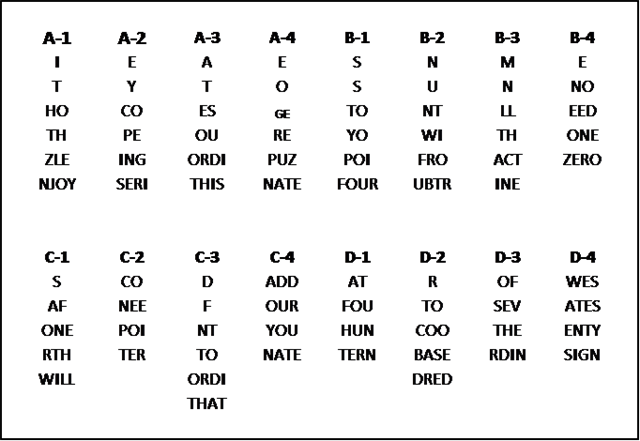 Your goal is to fit the puzzle pieces into the proper place in the grid to reveal a message that will lead you to the final cache location. Fill in the puzzle pieces horizontally into their corresponding sections of the grid. The sections are identified by letter-number combinations (A-1, A-2, A-3, etc.) The solution will read left to right, line by line. A red square indicates the end of a word. Yet, words do not necessarily end at the end of a line. Good luck!!