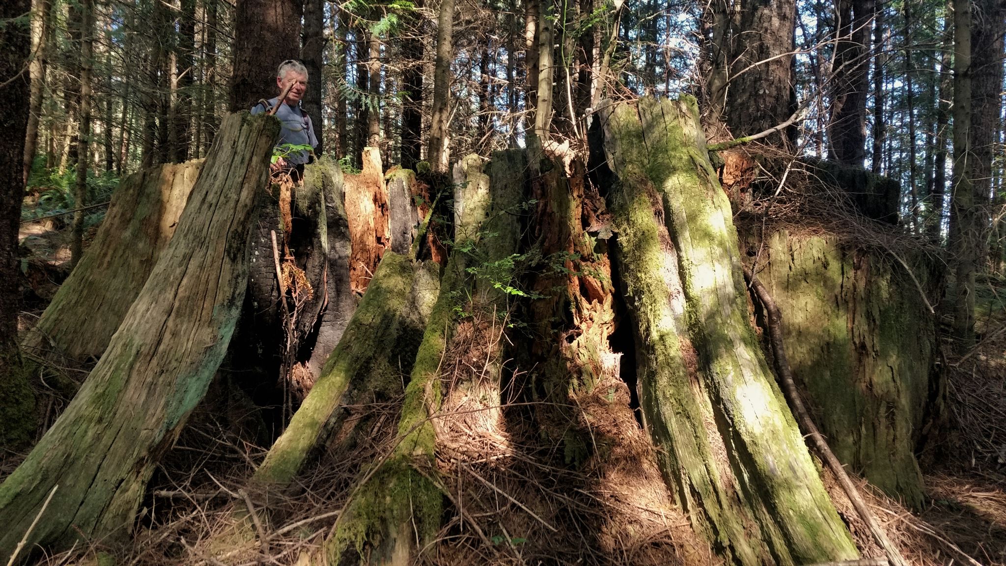 The cache is placed in the very bottom of a 6-foot stump. Very near this cache is the biggest stump I have ever seen. It is fragile and hollow so I did not want to place a cache there but be sure to check it out. It's amazing!!!