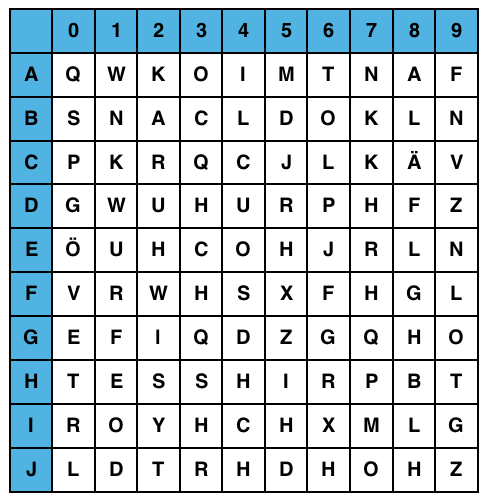 Finde die umschriebene Lösung, finde die chemische „Formel“, suche die Lösung im Quadrat, notiere Buchstaben und Zahl des ersten Lösungsbuchstabens.