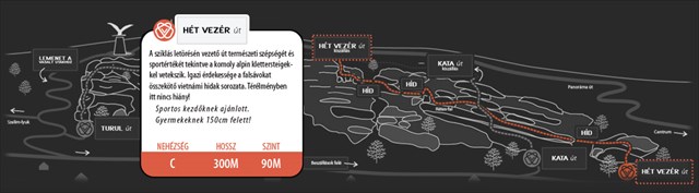 A területen 3 különböző nehézségű pálya került kiépítésre. A láda a a Hét Vezér nevű pálya végigjárása közben kereshető meg. Ez mindhárom közül a legkönyebb, azonban ide is komoly odafigyelés és megfelelő erőnlét szükséges. Autóval legkönyebben a Turul melletti felső parkolót használva tudsz megállni.