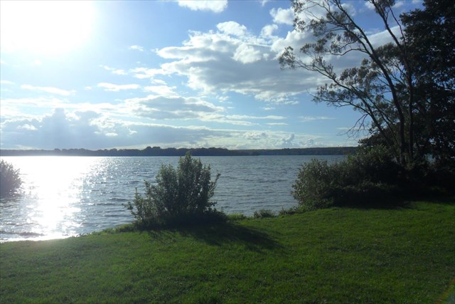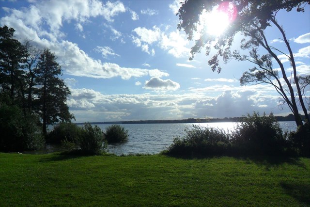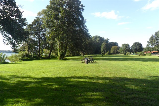 Ihr habt den staubigen Weg des Zeltplatzes verlassen und vor Euch tut sich linkerhand eine weite Wiese am Ufer auf. In der Regel ist hier kaum etwas los, sodass dieser malerisch grüne Platz Euch ganz allein zur Verfügung stehen könnte. Hier bieten sich mehrere Möglichkeiten zur Rast (nicht überdacht) und zum Baden (für die nächste Zeit die letzte Möglichkeit auf der Runde abgesehen von einer kleinen Badestelle am Langen See) oder Ihr nutzt die Uferwiese nur zum Relaxen und genießt ein wenig den Ausblick über den See.