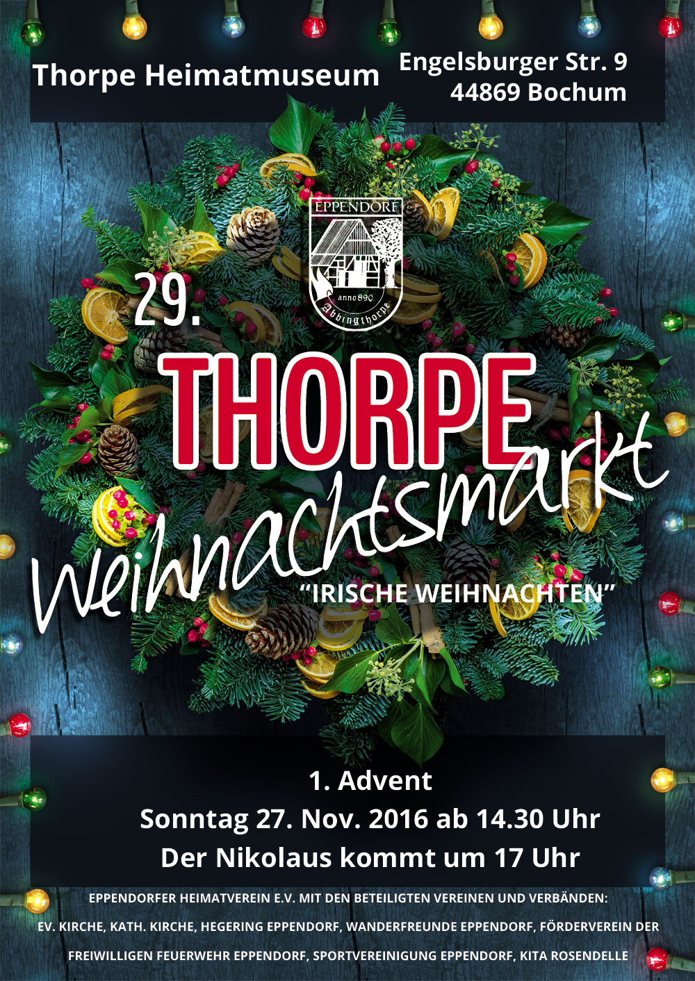 Der Thorpe Weihnachtsmarkt öffnet am 1. Adventsonntag, 27. November, seine Pforten. Und zwar am Standort auf dem Museumsgelände an der Engelsburger Straße 9. Veranstalter ist der Eppendorfer Heimatverein e.V. mit vielen Verbänden und Vereinen aus Eppendorf.