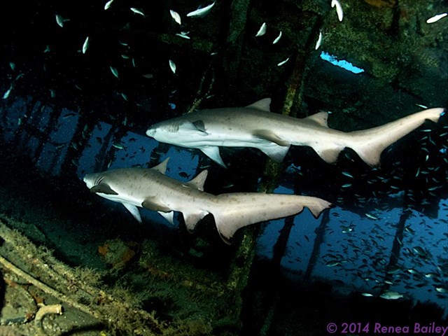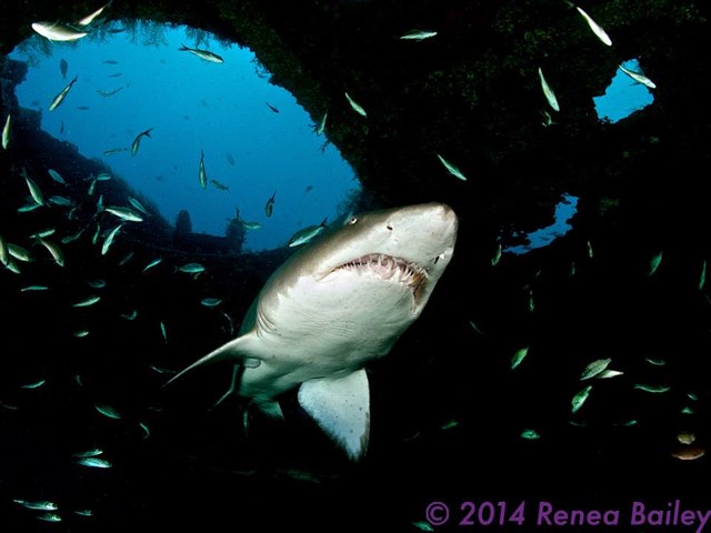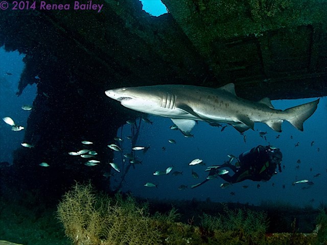 This is a prime site to dive with and photograph sand tiger sharks. In recent years, the sharks have taken up residence and cruise around in the open cabin area on the stern of the wreck. This has become known as "Club Aeolus" for the sharks...it is their club. This site is my favorite site to go to for photographing sharks as well as hanging out with them in da' club. :) Here are a just a couple of my many shark pictures taken on the wreck:
