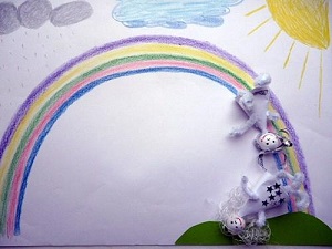 Dicht hintereinander ziehen sich die beiden am Regenbogen in die Höhe. Je höher sie kommen, desto schöner leuchten die Farben und die Engel freuen sich über diesen wunderschönen Anblick. „Bald sind wir oben", ruft der eine Engel, „halte dich gut fest. Der Regenbogen ist sehr glatt". Aber kaum hat er dies ausgesprochen und den höchsten Punkt erreicht, rutscht er auf der anderen Seite des Regenbogens wie auf einer großen, bunten Rutschbahn wieder hinunter. Auch der andere Engel kann sich nicht halten und saust mit einem großen Rutsch hinterher. Beide landen am anderen Ende des Regenbogens direkt vor einem großen Wald mit hohen Bäumen.