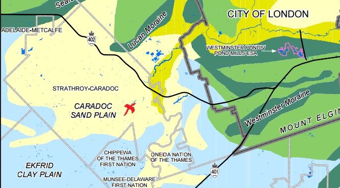 Even though Carolinian Canada is quite small compared with other Canadian vegetation zones, making up only 1% of Canada's total land area, it boasts a greater number of both flora and fauna species than any other ecosystem in Canada. It is estimated that some 2,200 species of herbaceous plants are found here, including 64 species of ferns, at least 110 species of grasses, and over 130 different sedge species. There are 70 species of trees alone. The soil composition of this region is largely sandy (a phenomenon referred to locally as the "Caradoc Sand Plains") as a result of deposits created on the bottom of the glacial Lake Whittlesey which covered the area approximately 14,000 years ago. The soils found in this region are of three types, Fox sandy loam, Berrien sandy loam and Oshtemo sand. Several small creeks, including the Mill Stream (east of Longwoods) and Komoka Creek, drain the area west of Delaware to the Thames River.