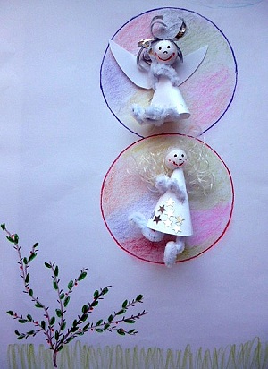 Die zwei Engel können es gar nicht glauben, der Zauberer hat sie tatsächlich in die riesengroße doppelte Seifenblase hinein gezaubert. Jetzt sitzen sie in einer schillernden, bunten Seifenblase und fliegen Richtung Himmel. Sie schauen hinunter auf die Erde und denken, dass es vielleicht das letzte Mal war, das sie auf der Erde waren. Sie winken den Kindern zu, die immer noch unten beim Zauberer stehen und die Engel in den Seifenblasen beobachten. Doch auf einmal werden die Seifenblasen vom Wind erfasst und nach unten getrieben. Mit dem nächsten Windstoß geht es aber geschwind wieder nach oben. Die Engel fliegen in ihren Blasen hoch und runter und hoch und runter. Den beiden Engeln wird es schon ganz übel. Doch plötzlich sehen sie unter sich einen Dornenbusch. Sie drücken beide die Augen zu und schon zerplatzen die Seifenblasen in viele kleine Wasserbläschen.