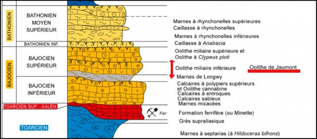 Strati Graphically, the "Pierre de Jaumont" visible in different streets of Longwy is located in the beginning of Upper Bajocien just above the "Marnes of Longwy".