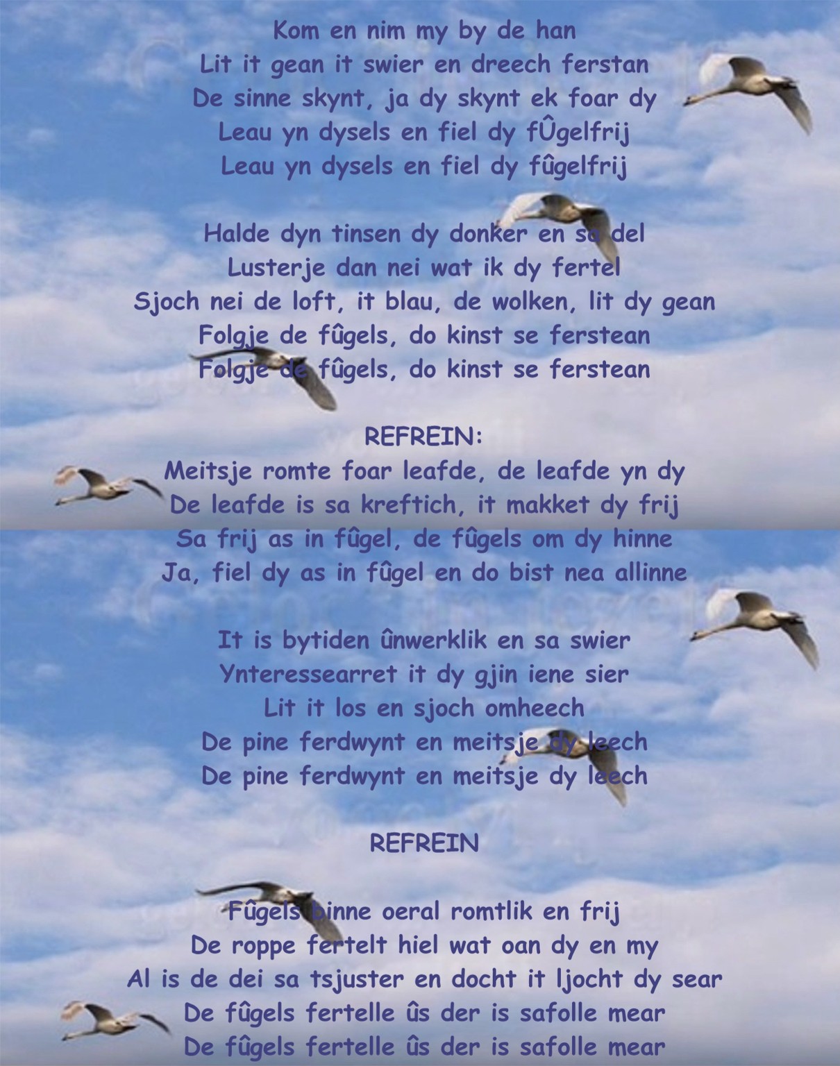 Voor de niet-Friezen is de tekst vertaald in de gerelateerde webpagina, waar je ook het liedje kunt horen.