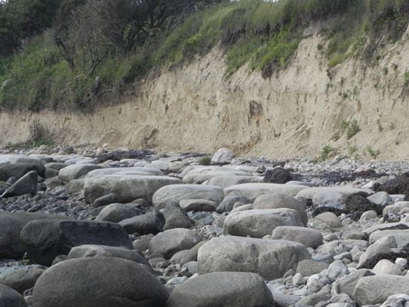 Erst durch die Abtragungen am Kliff wurde diese Gletscherstraße seit ca. 10 Jahren freigelegt. Die Rücksetzung des Steilufers betrug hier in den letzten Jahren ca. 0,5 Meter jährlich.