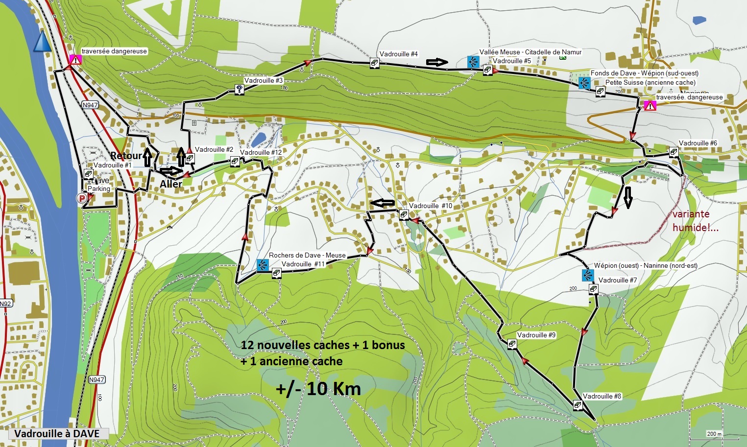D’un point de vue pratique, vous pourrez facilement vous garer au départ, en N50°24.898 – E007°53.101. Cette balade en boucle compte 12 nouvelles caches + une bonus (n’oubliez pas de noter les codes qui se trouvent dans chaque cache) + une ancienne cache (Paysages du namurois : la Petite Suisse à Naninne - GC5PBM8). La distance à parcourir est d’environ 10 kilomètres, elle est donc à réserver aux cagouilles avec de bons pieds ! La boucle est très difficilement envisageable en poussette, ainsi qu’en VTT (sauf pour les très très gros mollets !).